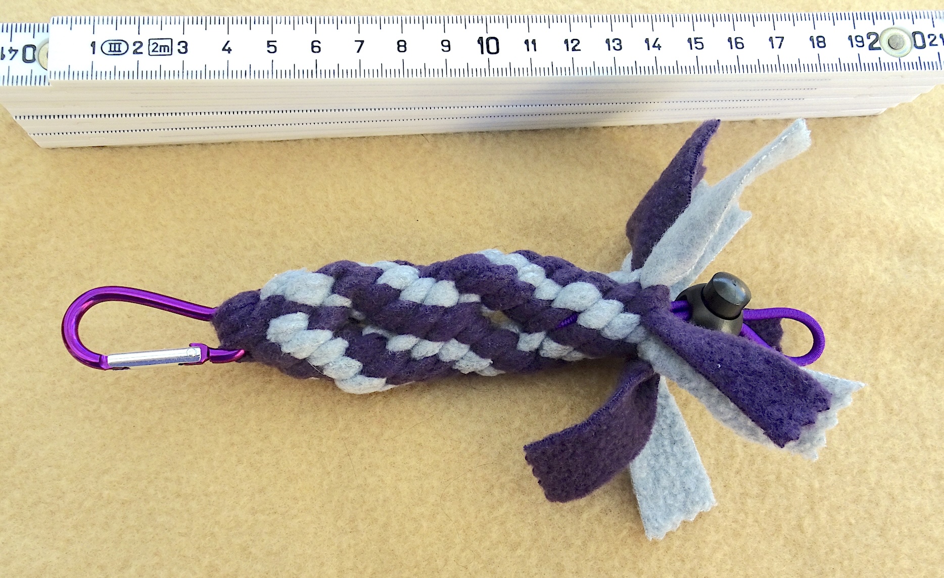 Er besteht aus einem Karabiner, einer Gummikordel mit hoher Zugkraft, einem Kordelstopper und einem handgemachter Halter.