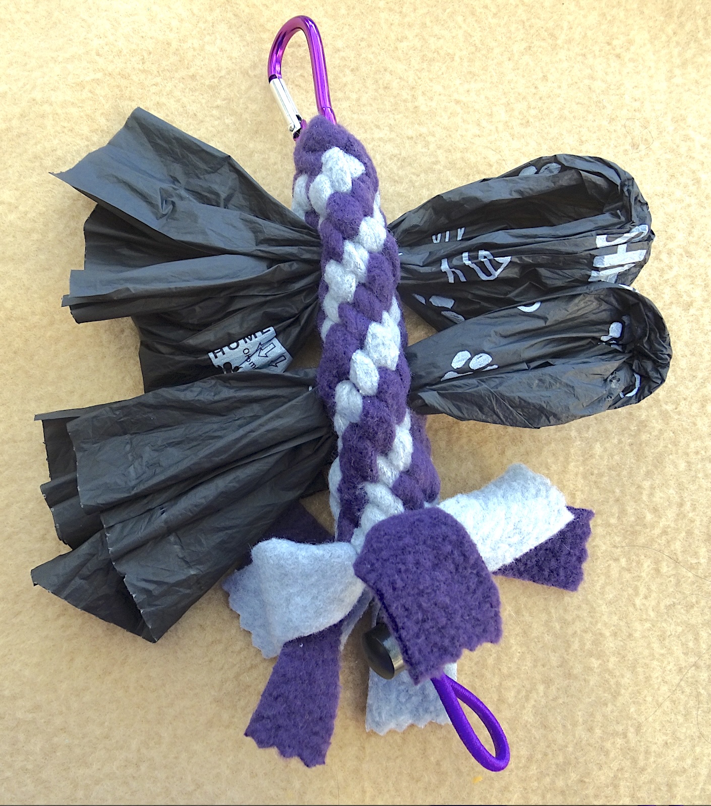 Die 2 Kotbeutel im Halter sind die kompostierbaren Pupssäckchen von Alphazoo.