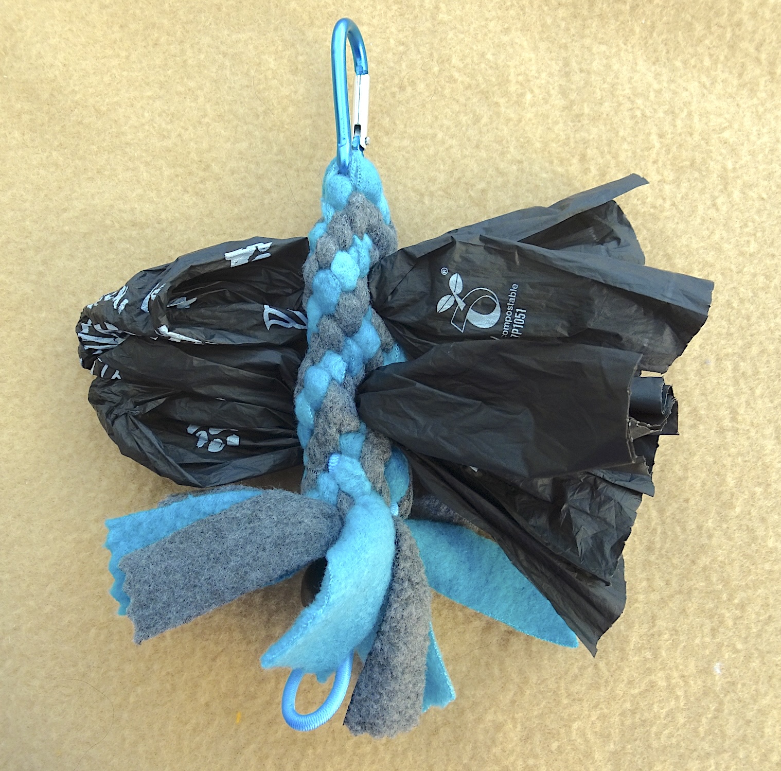 Die 2 Kotbeutel im Halter sind die kompostierbaren Pupssäckchen von Alphazoo.