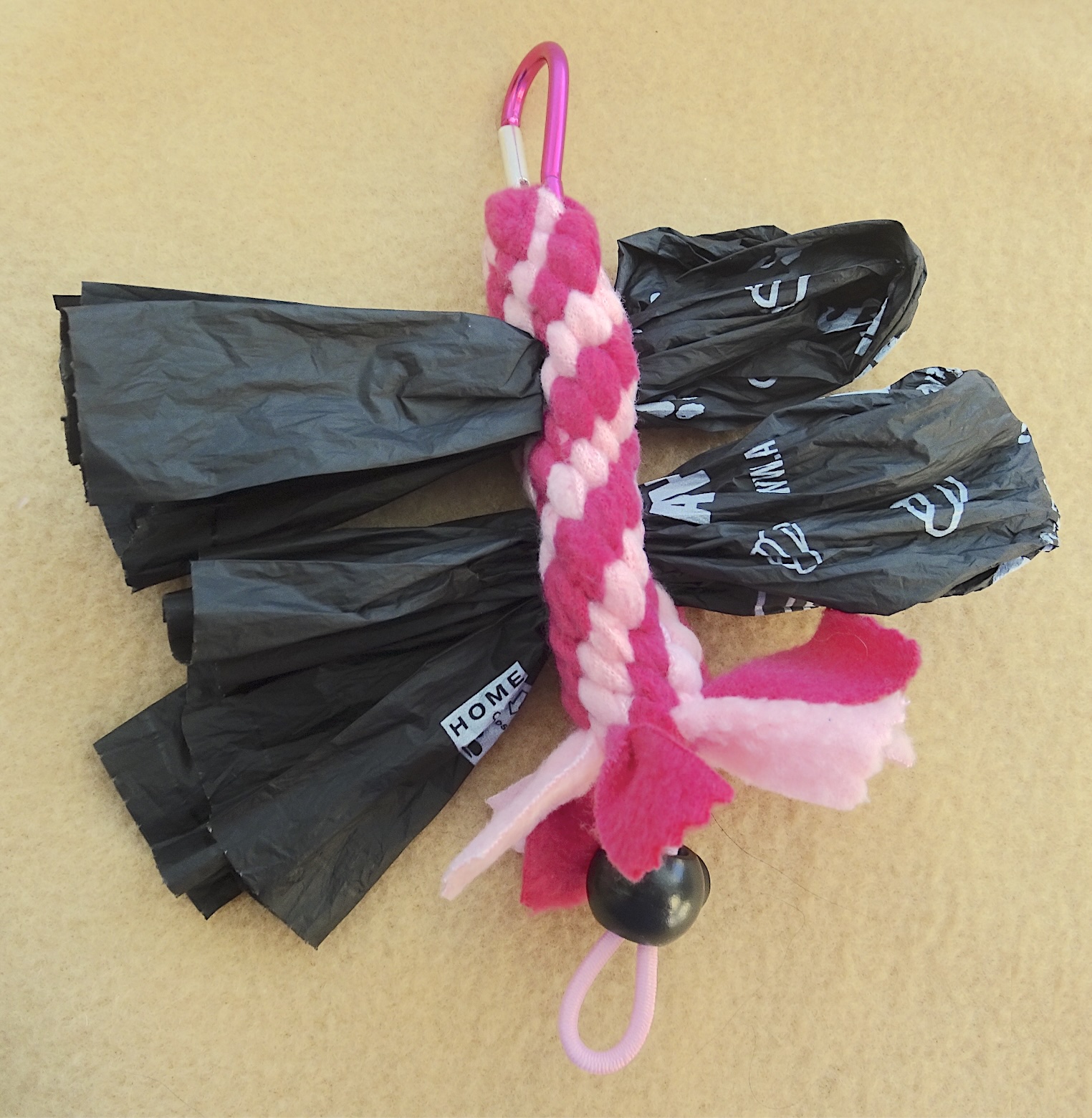 Die 2 Kotbeutel im Halter sind die kompostierbaren Pupssäckchen von Alphazoo.