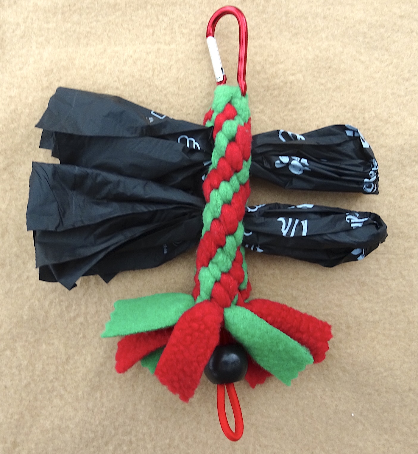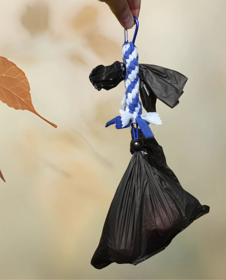 Die 2 Kotbeutel im Halter sind die kompostierbaren Pupssäckchen von Alphazoo.