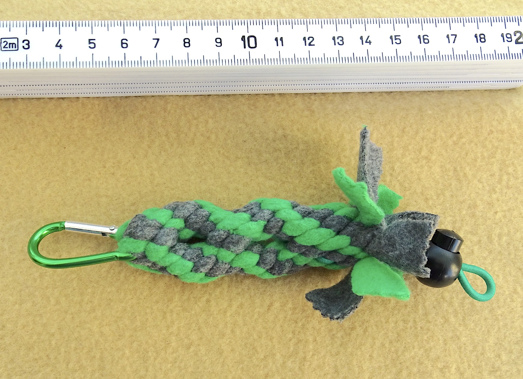 Er besteht aus einem Karabiner, einer Gummikordel mit hoher Zugkraft, einem Kordelstopper und einem handgemachter Halter.