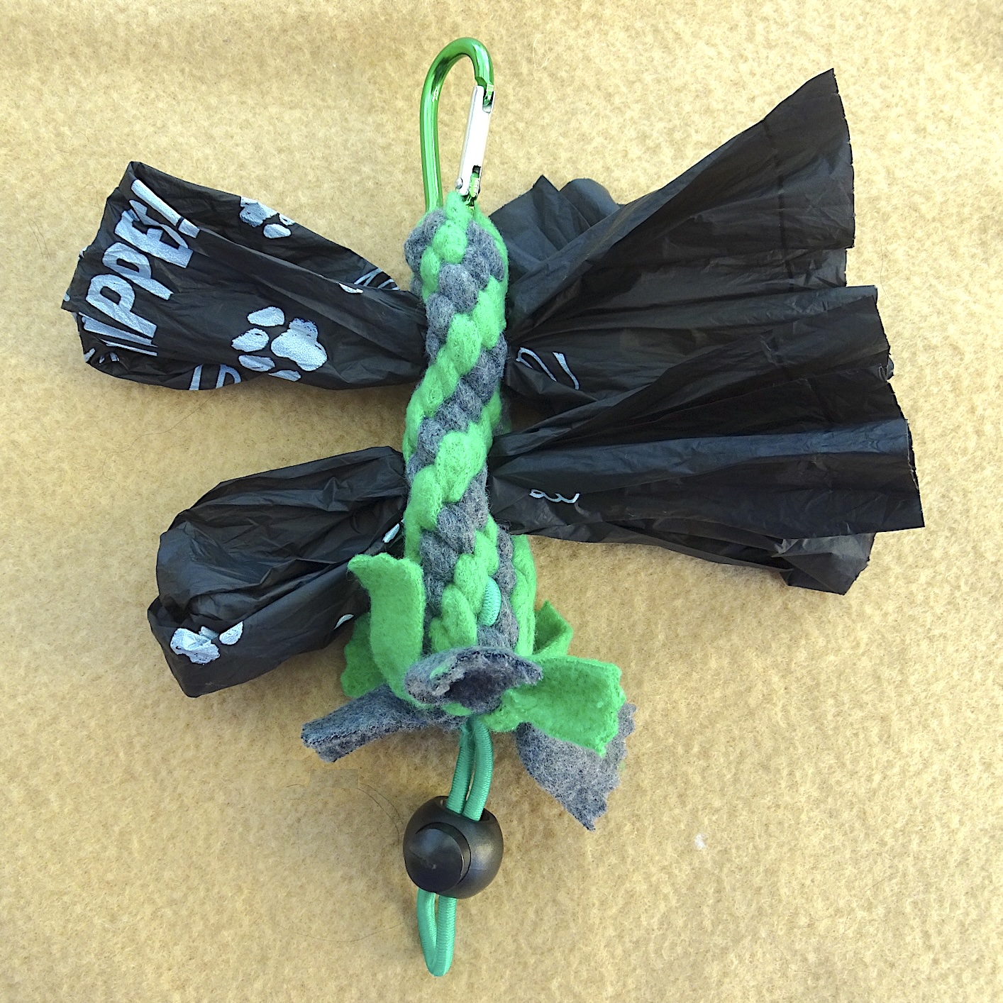 Die 2 Kotbeutel im Halter sind die kompostierbaren Pupssäckchen von Alphazoo.