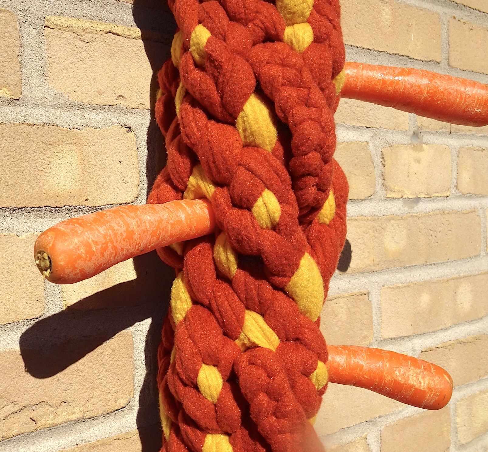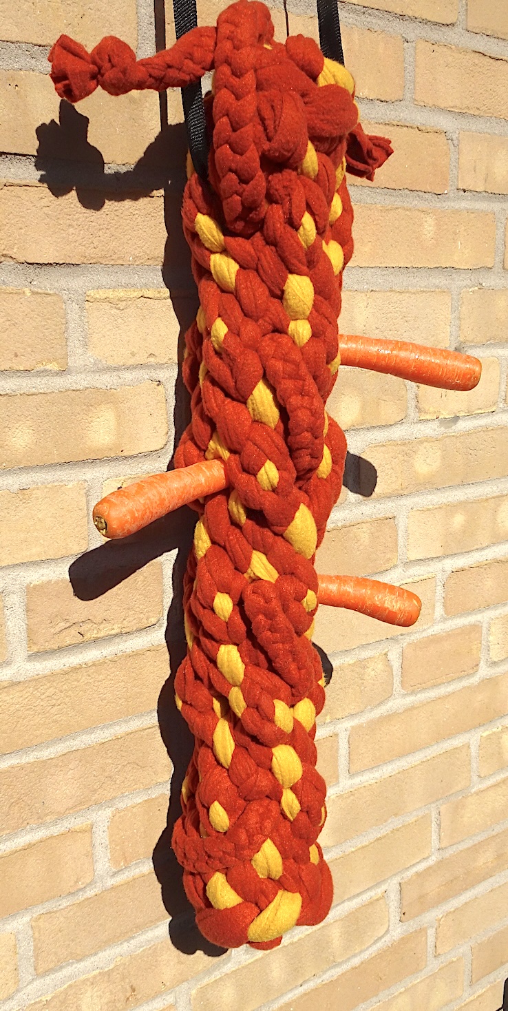 Möhren und anderes Futter können in die Löcher gesteckt werden. Ein Durchstecken von langen Möhren ist möglich. Außerdem gibt es ein Band zum Festklemmen von größeren Stücken wie z.B. Apfelstücken (siehe Bilder). Das Band kann fest gezogen werden. Die Befestigung dafür ist oben.