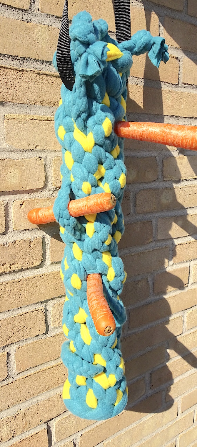 Möhren und anderes Futter können in die Löcher gesteckt werden. Ein Durchstecken von langen Möhren ist möglich. Außerdem gibt es ein Band zum Festklemmen von größeren Stücken wie z.B. Apfelstücken (siehe Bilder). Das Band kann fest gezogen werden. Die Befestigung dafür ist oben.