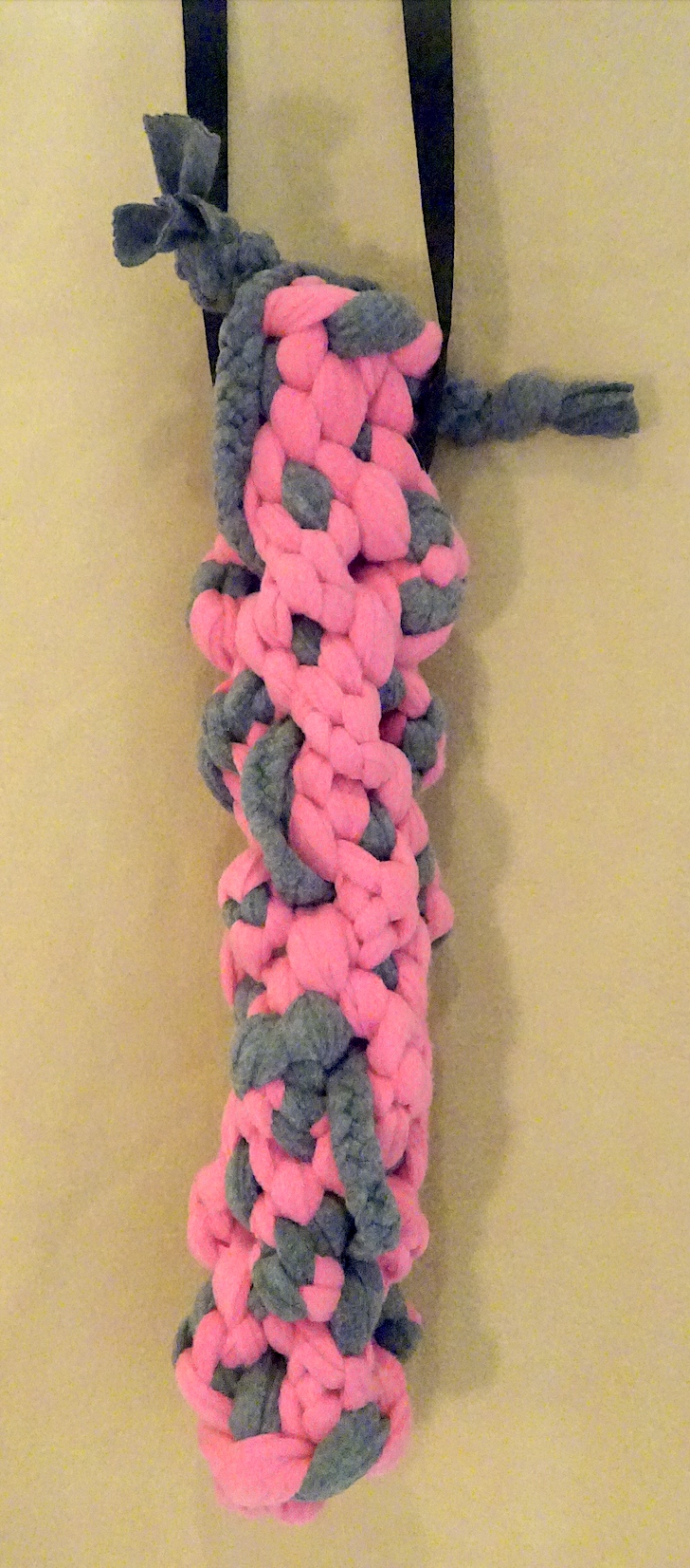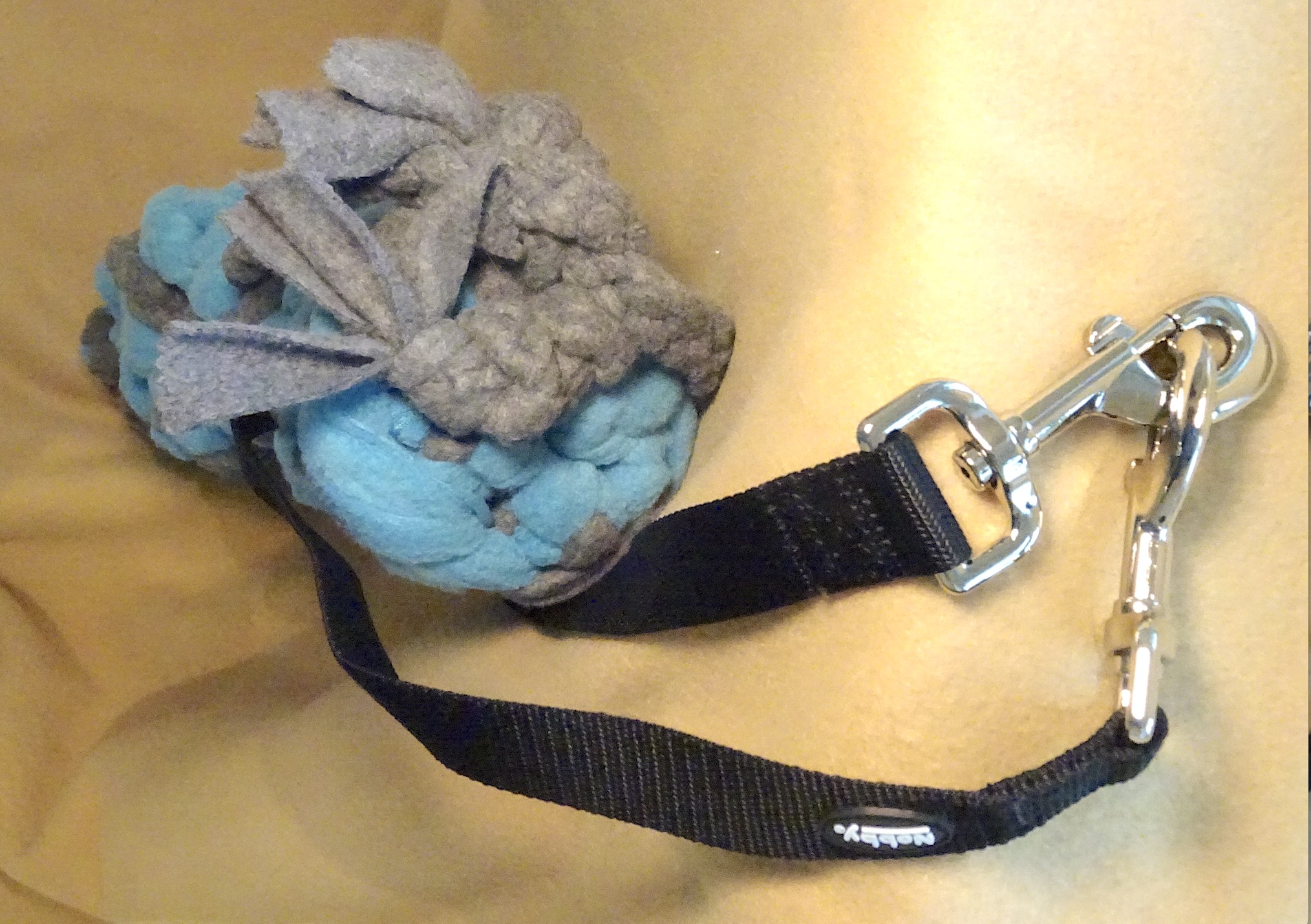 Aufgehängt is das Spielzeug mit stabilen Nylon Bändern mit Karabinern.
