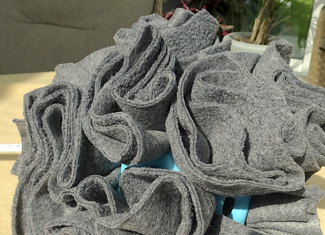 Die 8-eckigen Stoffstücken mehrfach falten bis eine Form wie eine Eistüte entsteht. Diese Rosette in die großen Löcher des Balles stecken. Die Leckerlies schön tief in die Rosetten einstecken. Der Hund darf und soll die Rosette zum Suchen rausziehen. Damit der Stoff nicht zerkaut oder geschluckt wird, bitte den Hund nicht mit dem Spielzeug allein lassen.